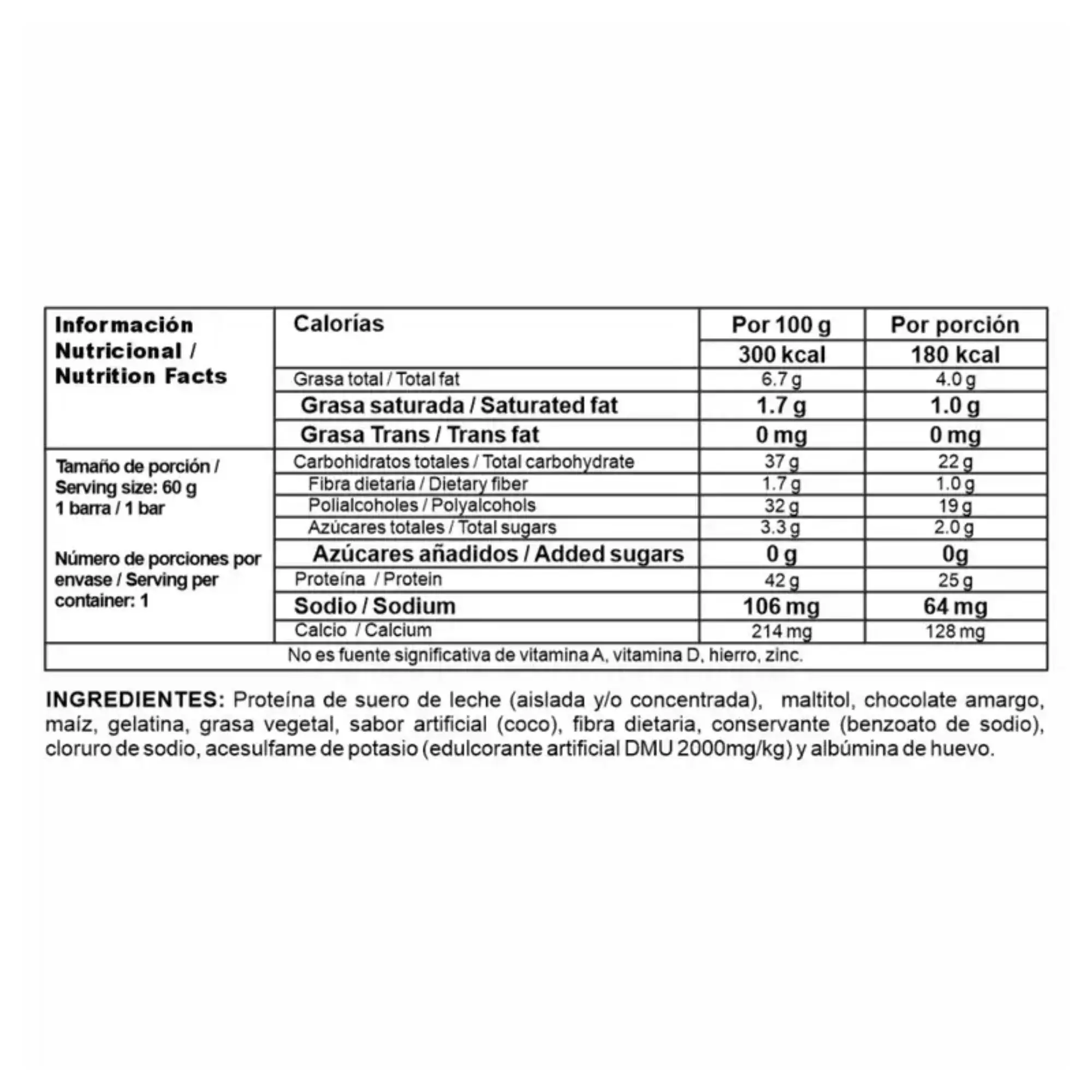 - Aporta 25 g de proteína de suero de leche por barra, contiene carbohidratos de bajo impacto insulínico para mejorar la sensación y control de ansiedad, y lo mejor de todo es que no contiene azúcar añadida, lo que la hace perfecta para cualquier persona que quiera controlar su ingesta de calorías y distribución de macronutrientes. Además, no contiene lactosa.